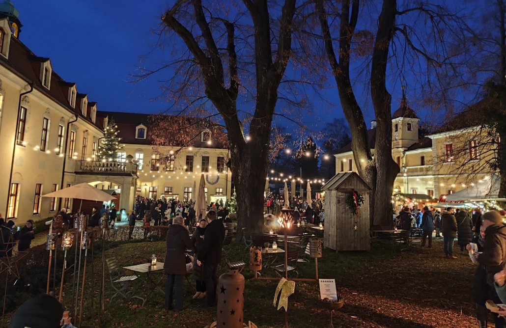 Brennende Feuerkörbe beim Eintreffen im Schlosshof, Proschwitzer „Elbfeuer“-Glühwein mit Stollen & Wein und Sekt am Weihnachtsbaum ergänzen und begleiten wunderbar % stimmungsvoll den Konzertabend mit Pianist Jonas Becker.